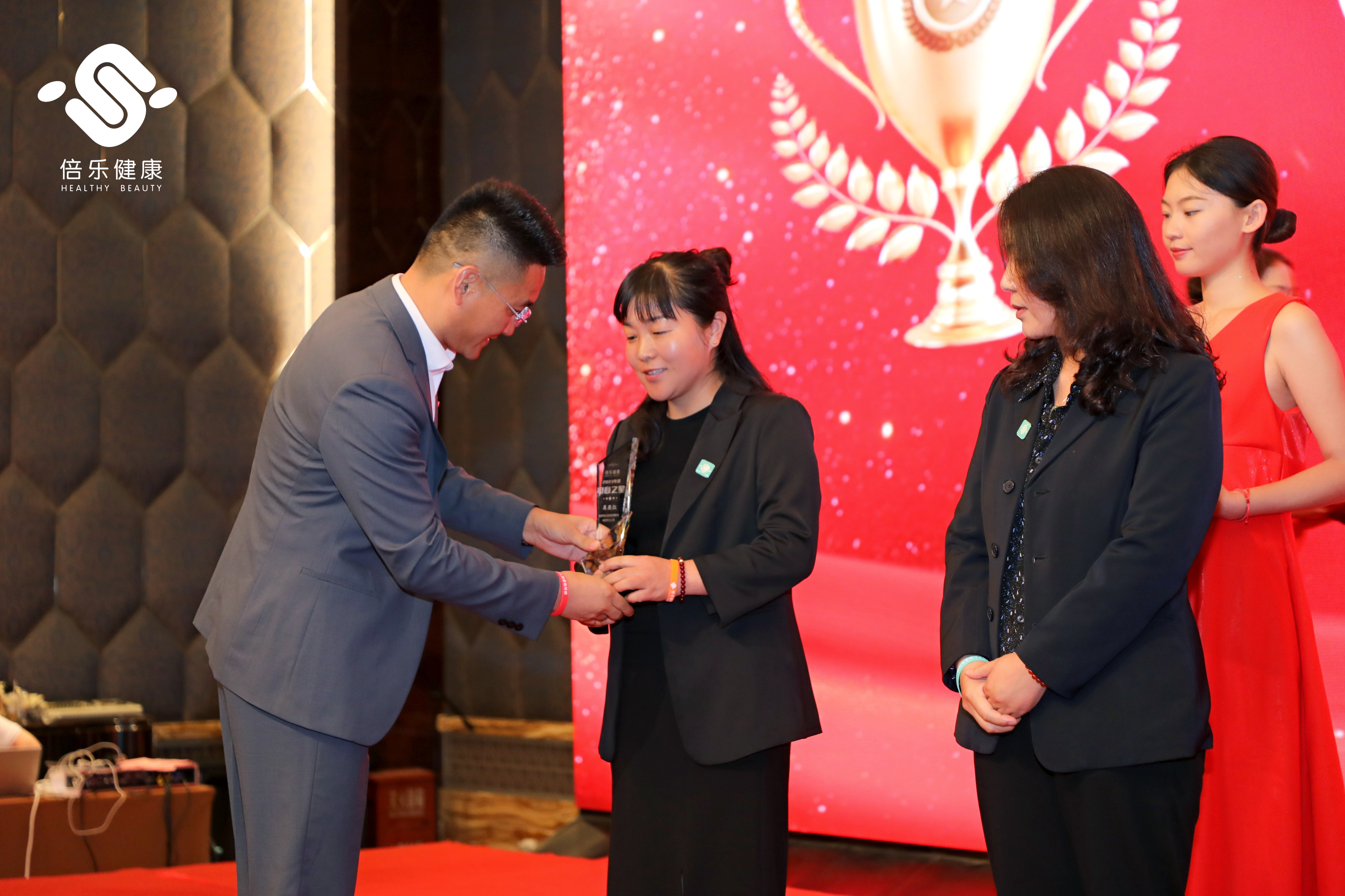 龔總詳細(xì)地為大家解釋了“小關(guān)節(jié) 大藍(lán)?!陛p創(chuàng)業(yè)項(xiàng)目的具體方案及項(xiàng)目前景,隨后活動(dòng)進(jìn)入頒獎(jiǎng)環(huán)節(jié),迎著激昂的音樂(lè),獲獎(jiǎng)代理商們陸續(xù)上臺(tái),張伯科博士、李玉朝董事長(zhǎng)和胡峰總經(jīng)理作為本場(chǎng)活動(dòng)的頒獎(jiǎng)嘉賓,為2022年9月-2023年8月期間的年度優(yōu)秀合作伙伴(即市場(chǎng)之星、商城之星、服務(wù)之星)頒發(fā)獎(jiǎng)杯并現(xiàn)場(chǎng)合影留念,臺(tái)上臺(tái)下變成了歡樂(lè)的海洋。