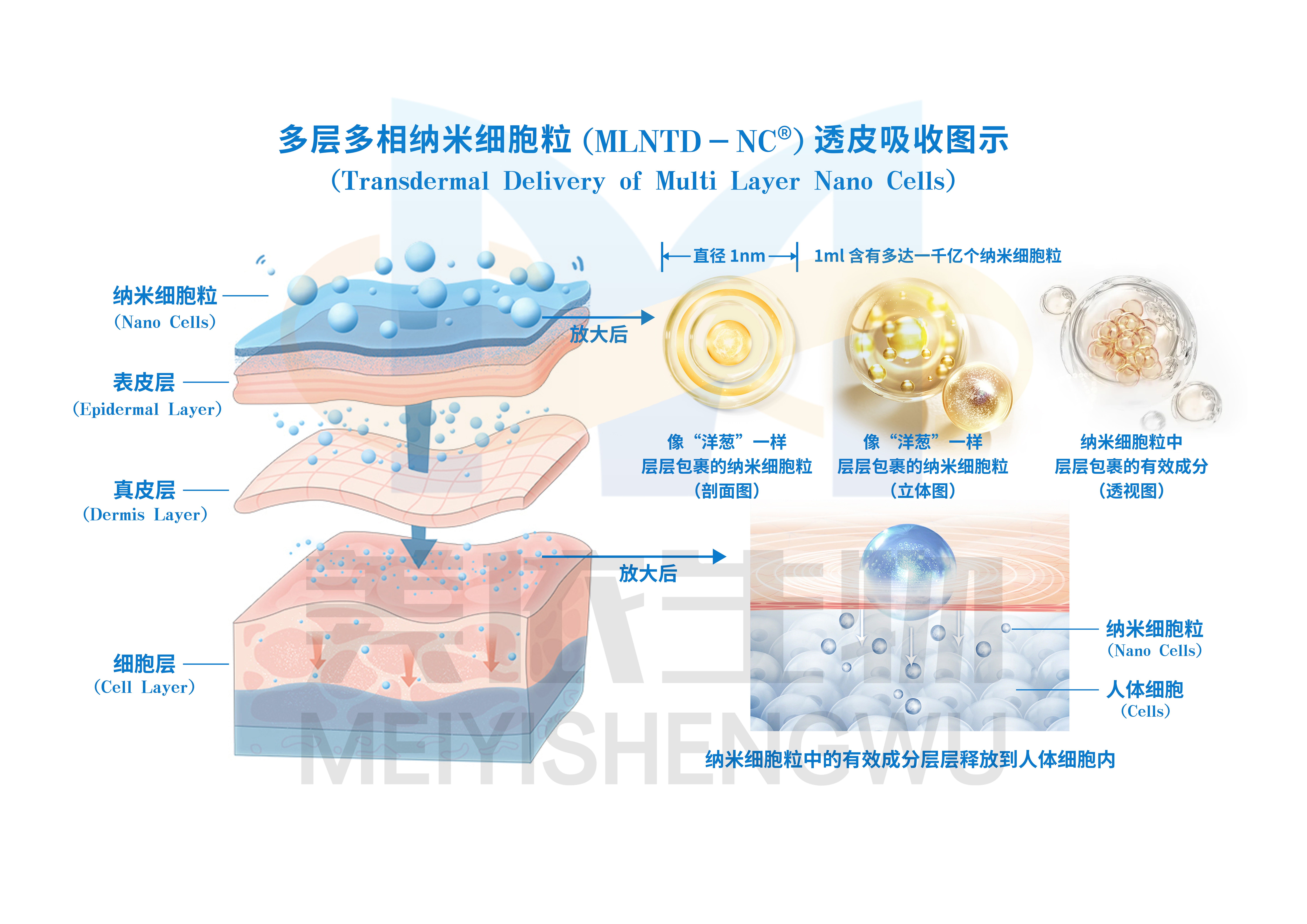 納米細(xì)胞粒(MLNTD-NC®)是由多層油相、水相相間隔,層層包裹有效成分和分子而形成的與人體細(xì)胞結(jié)構(gòu)非常相似的微觀載體。它的形狀酷似洋蔥,直徑大小只有1納米左右,比細(xì)胞小1萬倍以上。